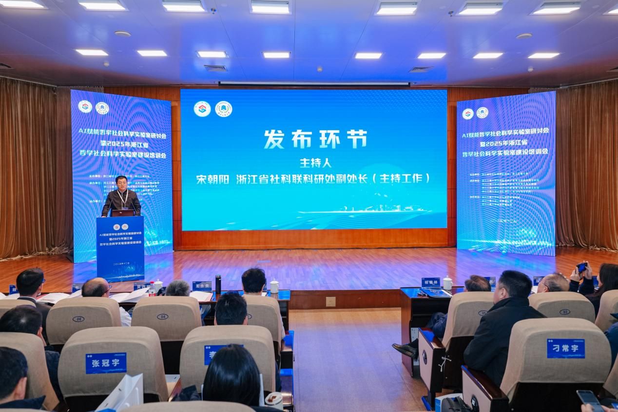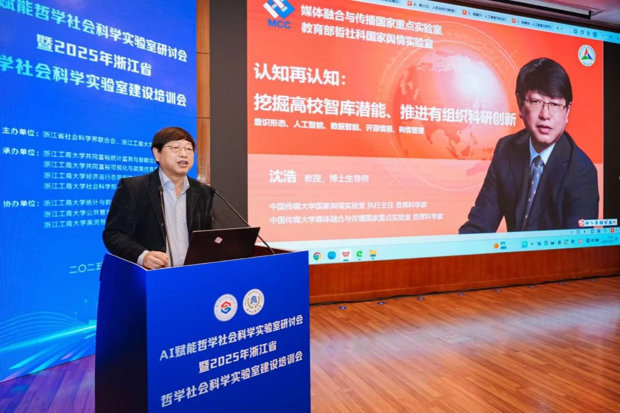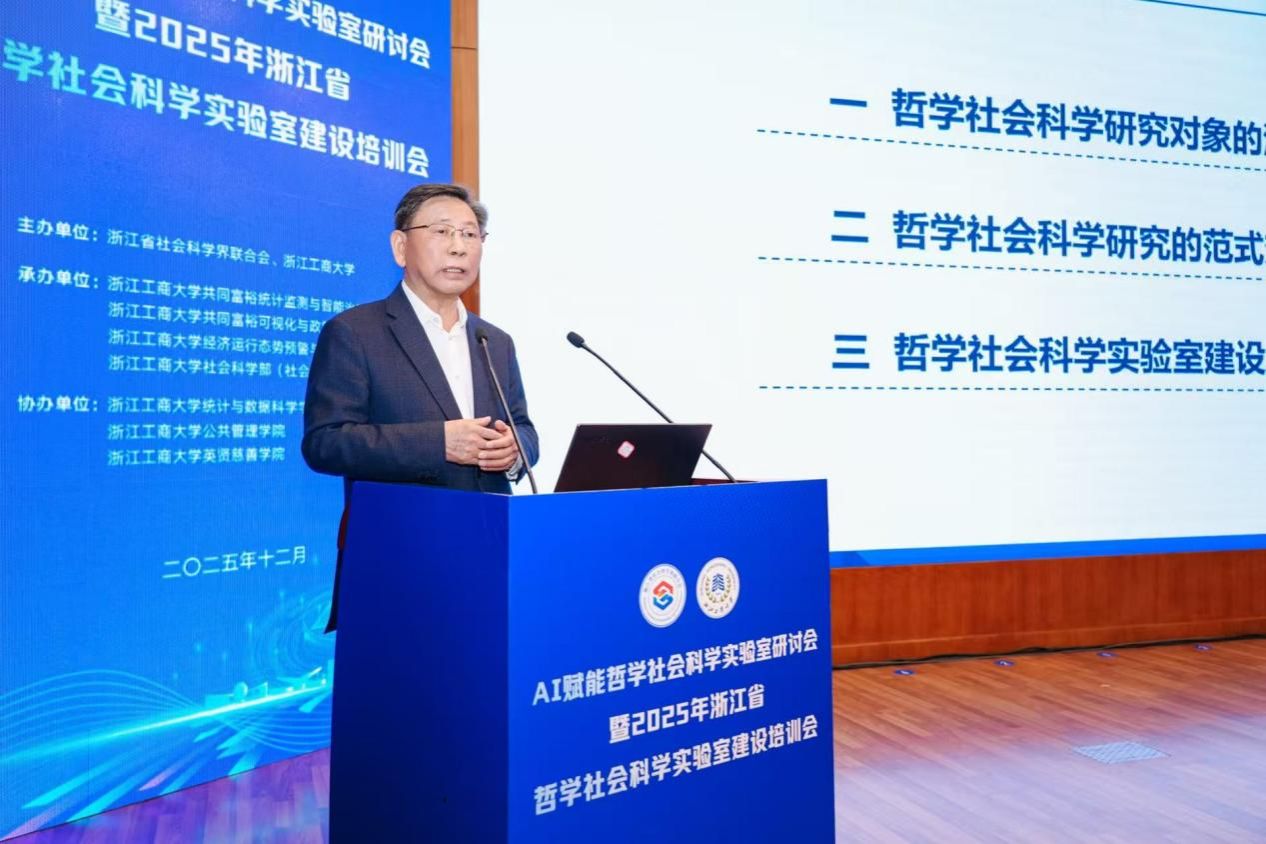 12月25日,由浙江省社会科学界联合会主办的AI赋能哲学社会科学实验室研讨会暨2025年浙江省哲学社会科学实验室建设培训会在浙江工商大学隆重举行。来自全省学界、业界及相关管理部门的领导、国内知名专家学者齐聚一堂,共商浙江省哲学社会科学实验室建设路径级创新发展蓝图。我校校长韦路、副校长李文冰等校领导,人文社科与创作处处长黄寒冰、副处长陈怡,出版学院院长、重点实验室方向负责人崔波等部门负责人出席会议,实验室骨干研究员余波副教授列席参会。